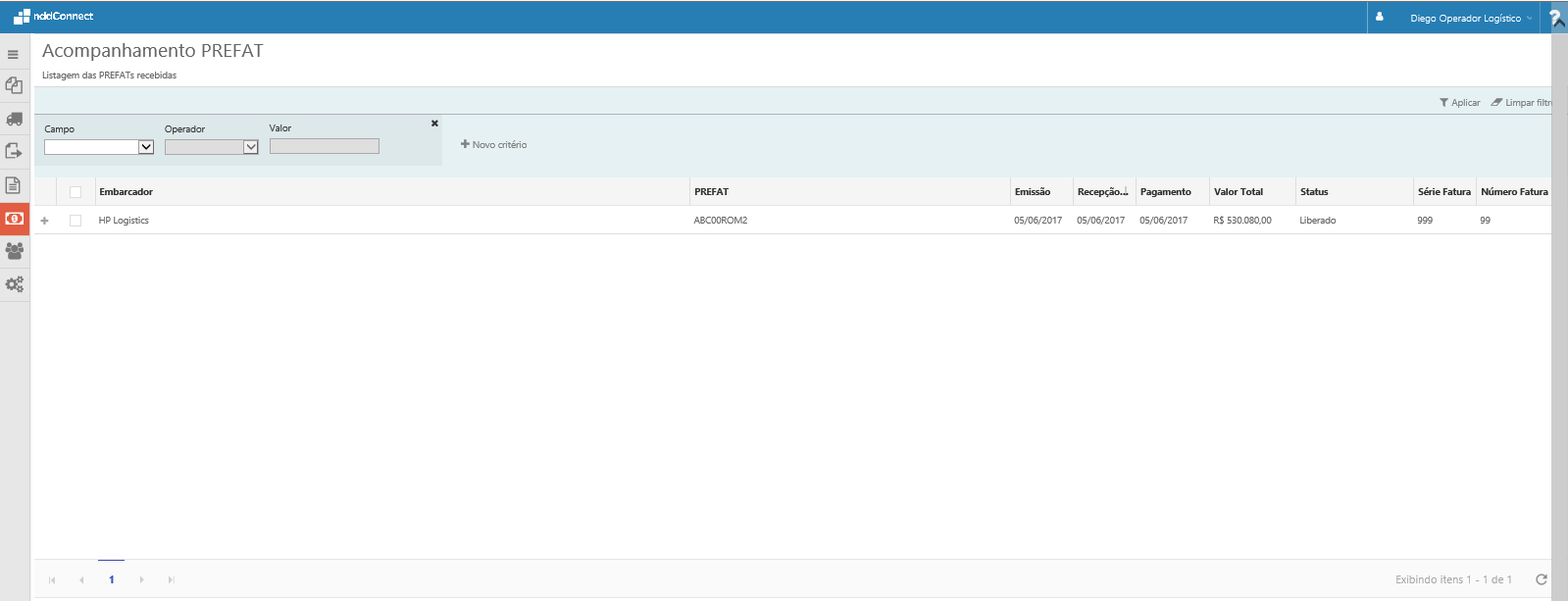 A tela de acompanhamento de PREFAT irá relacionar os documentos enviados pelo embarcador (através de upload no portal do embarcador ou via Web Service), que estão de acordo com as seguintes regras:1.A configuração de "Recebimento da PREFAT" deve estar ativa para o cliente; 2.Os DPS informados devem estar em "em operação"; 3.Os DPS informados devem estar com status "autorizado"; 4.Os DPS informados não podem estar vinculados à outra PREFAT liberada ou aguardando liberação; 5.A soma do valor total dos DPS deve ser igual ao valor da PREFAT; a.Caso o valor da PREFAT seja menor que o valor total dos DPS, a mesma é apresentada na tela de "PREFAT Inconsistentes" para que seja possível aplicar desconto sobre os DPS; b.Caso o valor da PREFAT seja maior que o valor total dos DPS, a mesma é apresentada na tela de "PREFAT Não Conformes". 6.O emitente dos DPS relacionados na PREFAT devem ser os mesmos; 7.O Tomador dos DPS relacionados na PREFAT devem ser os mesmos; 8.Caso seja enviada uma PREFAT com a mesma identificação de uma já existente no sistema, será verificado no momento da recepção se já possui "Liberação para Pagamento", se não possuir, a PREFAT será atualizada com os dados do último envio, caso contrário, a última PREFAT enviada será exibida na tela de "PREFAT Não Conforme" e os dados não serão atualizados.