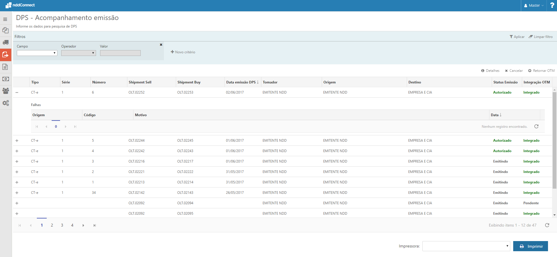 A tela de acompanhamento irá exibir os Shipments Sell aptos para emissão e os respectivos DPS, quando emitidos. O monitoramento da emissão ocorre através dos seguintes status: •Pendente: Sinaliza que o DPS está apto para emissão, mas o embarque ao qual o Shipment Sell pertence não foi emitido; •Emitindo: Identifica os DPS vinculados às viagens que foram enviados ao emissor; •Em Contingência: Identifica os DPS que entraram em contingência; •Rejeitado: Indica que o documento gerado foi rejeitado. Será possível visualizar o motivo através dos detalhes do embarque; •Cancelado: Sinaliza que o documento gerado foi cancelado; •Denegado: Sinaliza que o documento gerado foi denegado; •Autorizado: Indica que o DPS gerado foi autorizado.