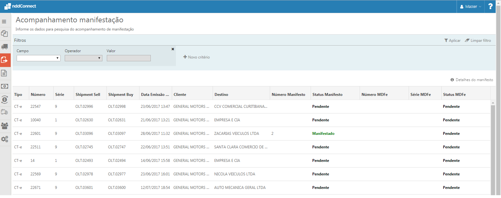 •Detalhes do Manifesto: Exibe as demais informações, não informadas em tela, relacionado ao registro selecionado;