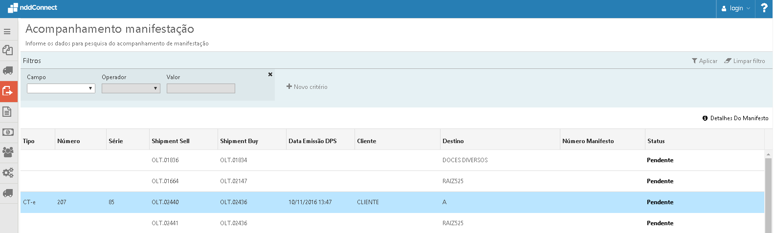 Nesta tela serão apresentados os documentos passíveis de manifestação com base no Shipment Buy. A coluna 'Status' apresenta o último status do processo de manifestação para aquele DPS.