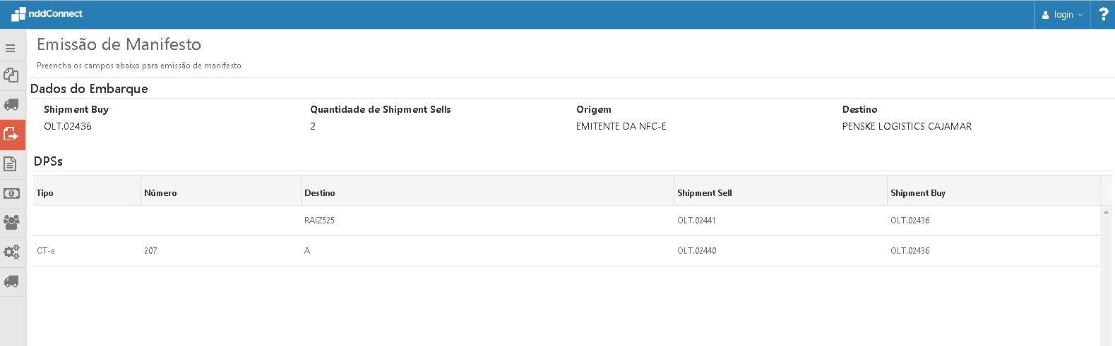 Ao selecionar um documento e clicar em "Detalhes Do Manifesto", será aberto uma tela contendo os dados do embarque e dos DPSs: