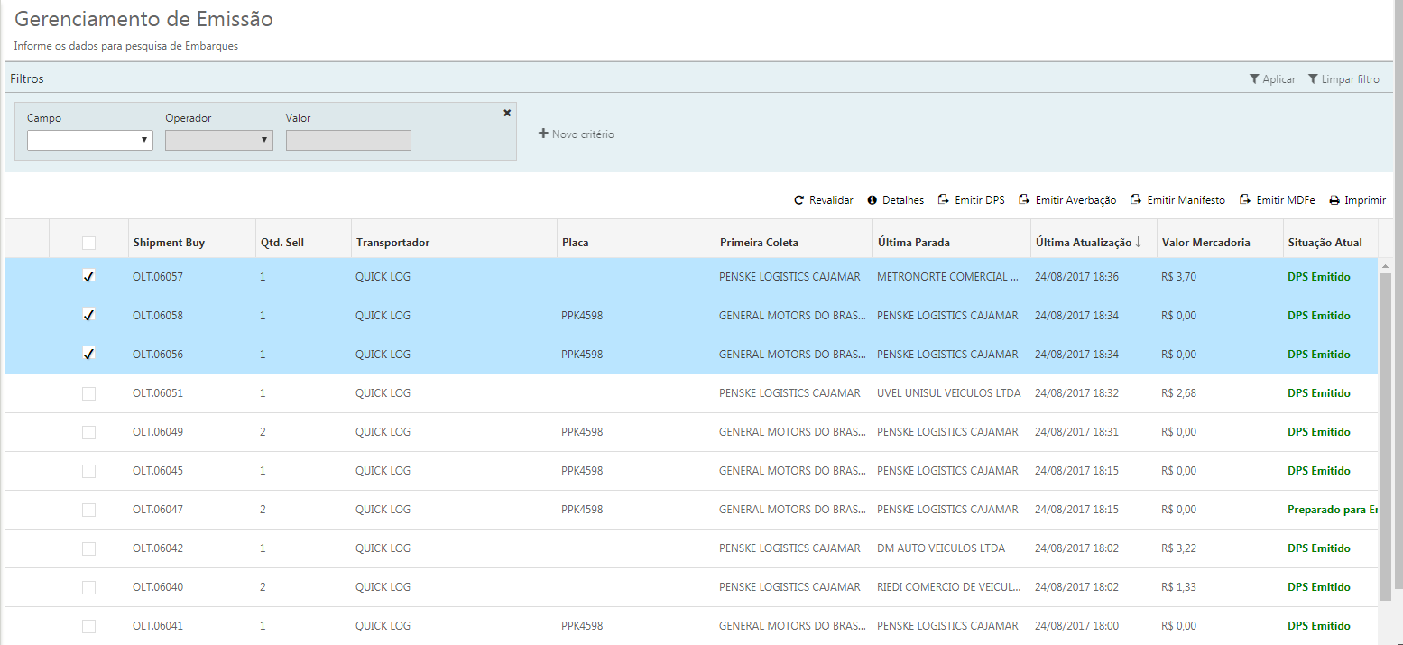 1.Adicionada na tela de "Gerenciamento de DPS" a possibilidade de selecionar mais de 1 registro por vez, a partir desta dessa opção é possível solicitar a impressão de mais de um CT-e, Manifesto. Caso o Shipment selecionado possua placa, a emissão de DPS será efetuada para todos os shipments normais vinculados a ele. Detalhes deste shipment buy pode ser exibidos no clique do botão "Detalhes" (quando selecionado somente um registro).