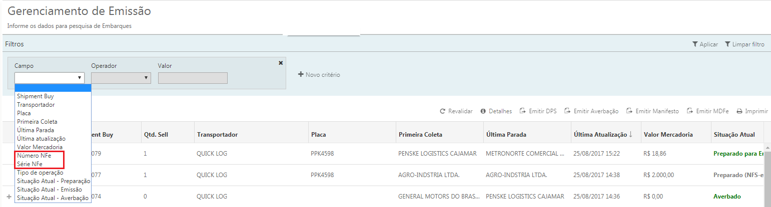 Foram efetuas as seguintes mudanças: •Removido a coluna "Agrupador" da grade; •Incluso a coluna "Qtde. sell" que indica quantos shipments sell estao vinculados ao Buy •Incluso a coluna "Placa" que ira ira indicar qual a placa do veiculo associado ao embarque, também indica que o shipment é um agrupador. •Incluso no filtro a opção de filtragem "Número NFe". •Incluso no filtro a opção de filtragem "Série NFe". •Incluso no filtro a opção de filtragem por tipo de operação.
