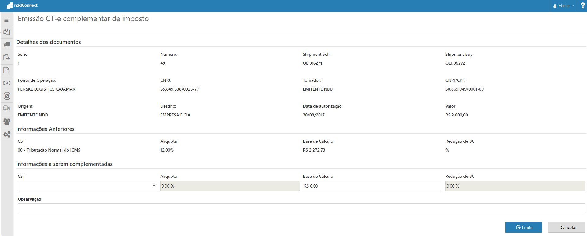 Na tela de Emissão de CT-e Complementar de Imposto, é possível visualizar os Detalhes do Documento selecionado, assim como é apresentado as Informações Anteriores, para que a partir dessas informações seja possível realizar a correção do CT-e que foi emitido errado.