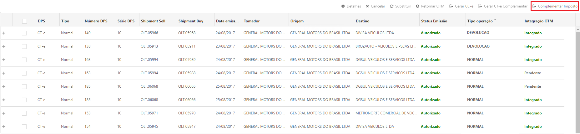 Foi adicionado novo botão 'Complementar Imposto', para que seja possível solicitar a emissão de CT-e complementar de imposto do documento selecionado.