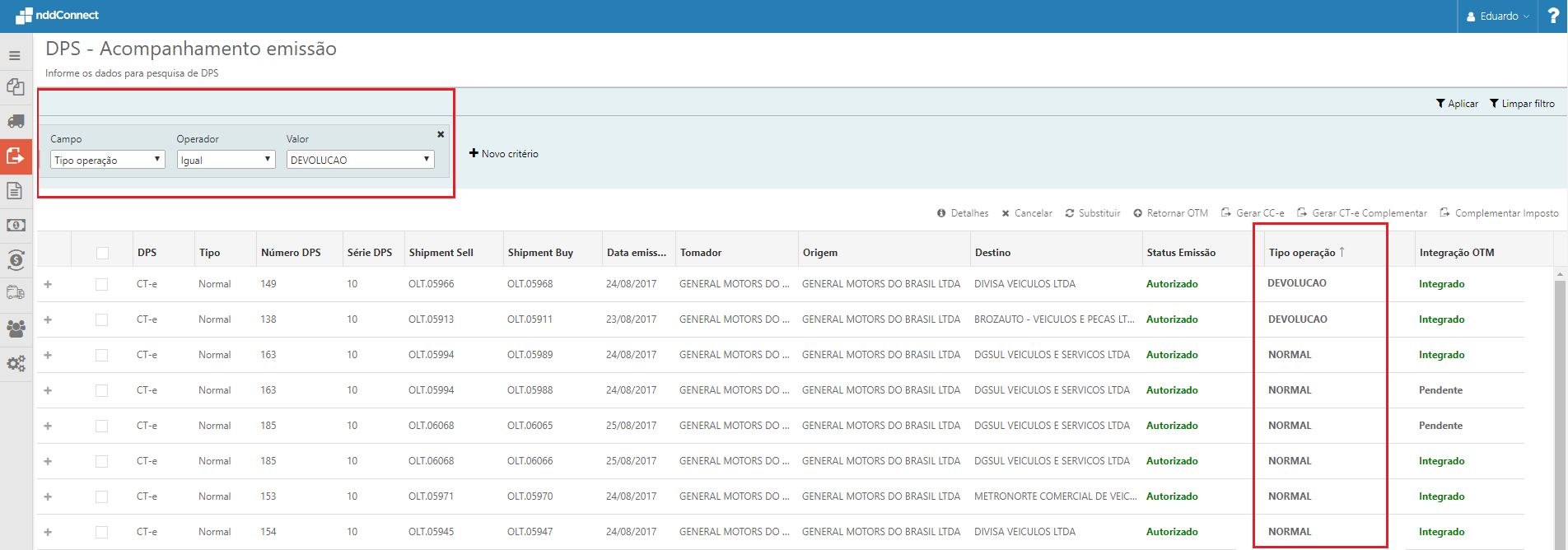•Alterado a descrição do filtro "Tipo" para "Tipo DPS" •Alterado a descrição do filtro de "Número" para "Número DPS" •Alterado a descrição do filtro de "Série" para "Série DPS" •Incluso no filtro a opção de filtragem "Número NFe". •Incluso no filtro a opção de filtragem "Série NFe". •Incluso no filtro a opção de filtragem por tipo de operação. •incluso no GRID a coluna tipo de operação.