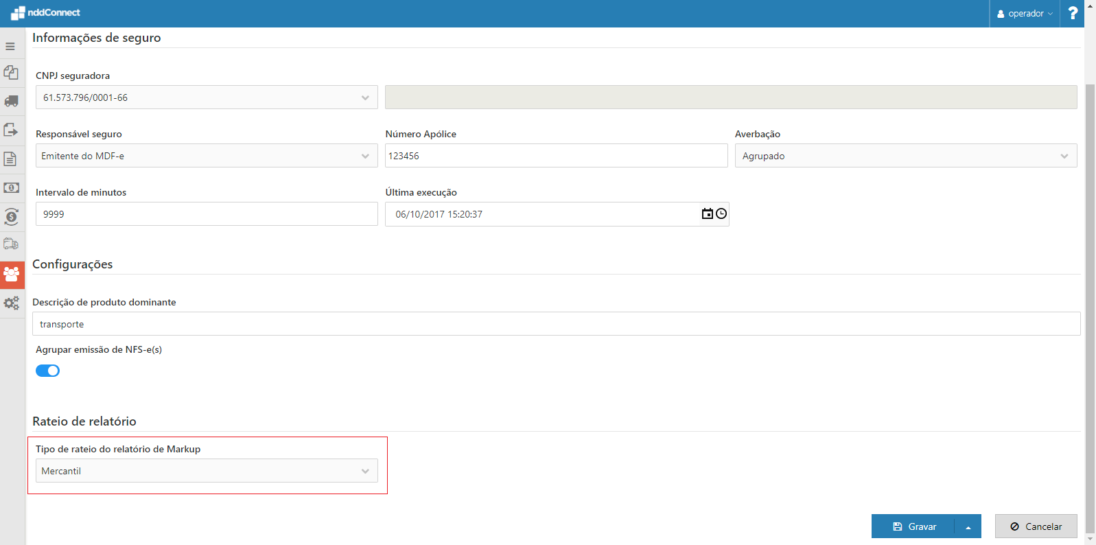 Removido o campo "Modalidade de cobrança de imposto", este passa a ser esperado como um parâmetro obrigatório no shipment. Adicionado o campo "Tipo de rateio de relatório de markup", este parametro indica a forma que será proporcionalizado os custos do shipment buy com os respectivos DPS no relatório de Markup.