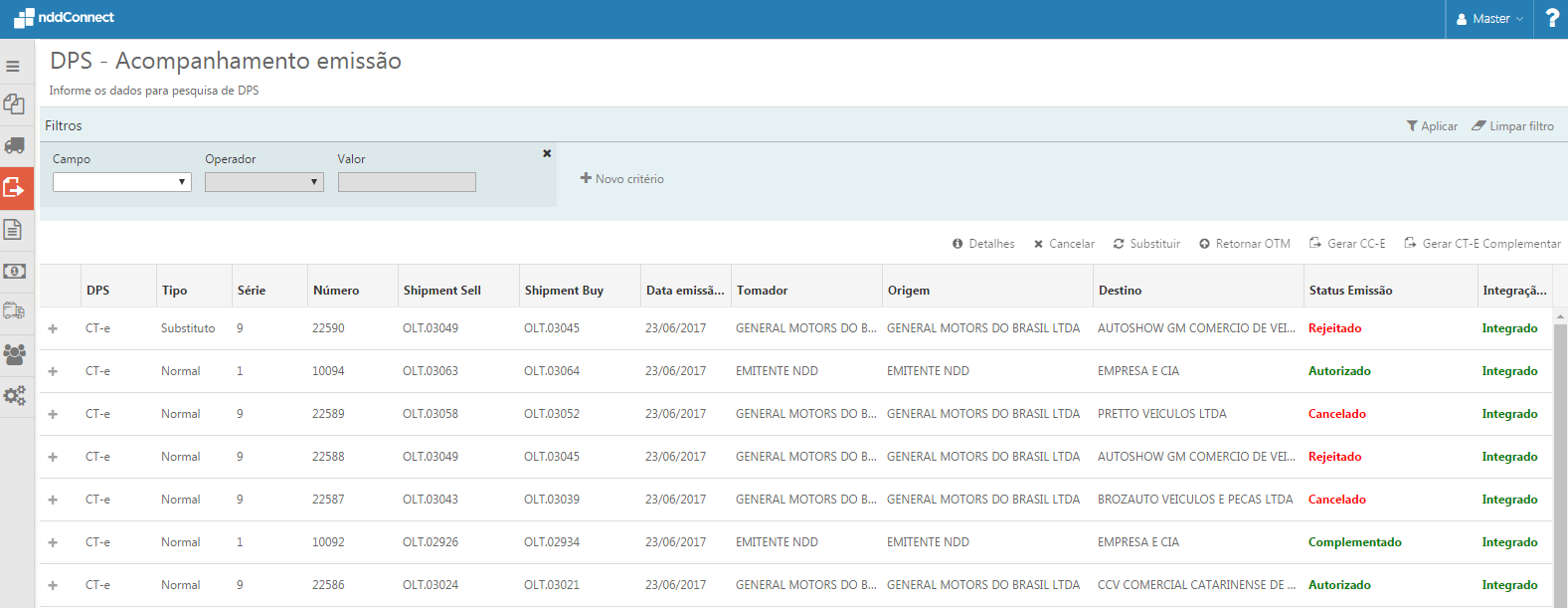 1.Adicionado no Acompanhamento de DPS a opção para o cancelamento dos CT-es autorizados; 2.Adicionado o acompanhamento da emissão de CT-es complementares, bem como, a solicitação para emissão do mesmo; 3.Adicionada a opção para gerar Carta de Correção eletrônica para os CT-es autorizados. 4.Adicionada nova aba de valores nos detalhes do shipment sell. 5.Adicionada a opção de substituição de CTe.