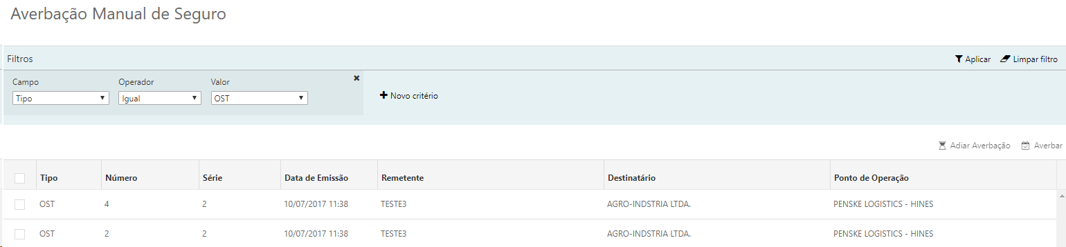 Na área de averbação manual de seguro, será apresentado DPS do tipo OST. Também será possível filtrar documentos do tipo OST. Conforme imagem a seguir.