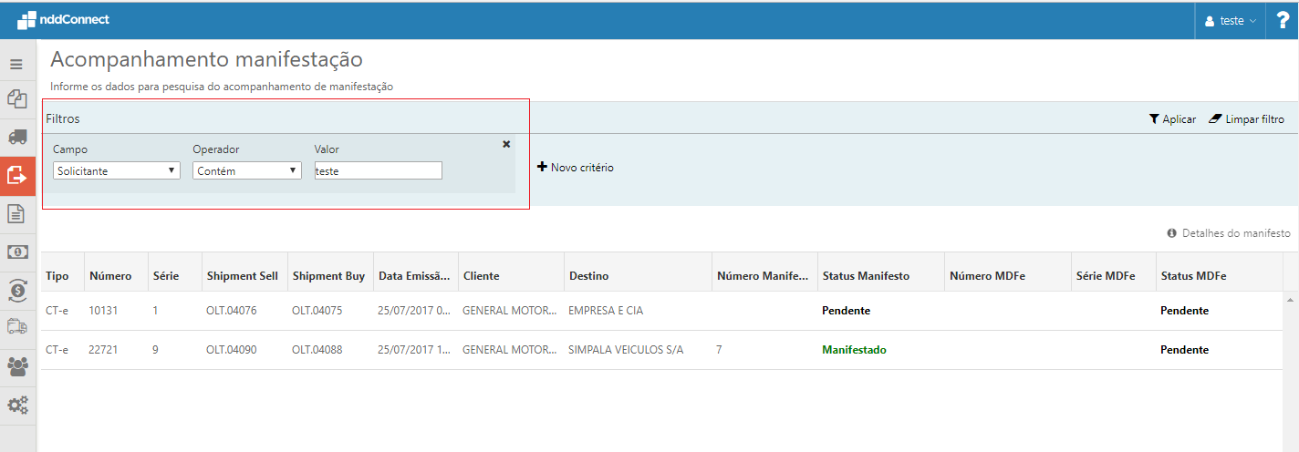1. Incluído a opção de filtrar pelo solicitante da emissão, levando em consideração, para o valor, o usuário de login do portal . 2. Adicionadas colunas com número, série e status do MDFe que serão utilizadas em uma futura implementação do MDFe.