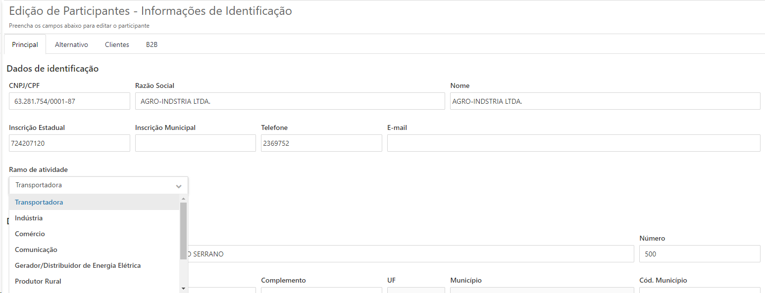 Na tela de cadastro e edição de participantes é incluído um novo campo "Ramo de atividade", seu preenchimento será obrigatório. Este é utilizado para indicar o CFOP do CTe no momento da emissão, quando este for o tomador do serviço. As opções disponiveis são: 1 - Transportadora 2 - Indústria 3 - Comércio 4 - Comunicação 5 - Gerador/Distribuidor de Energia Elétrica 6 - Produtor Rural 7 - Não Contribuinte 8 - Exterior 9 - Prestação de Serviço não Especificado