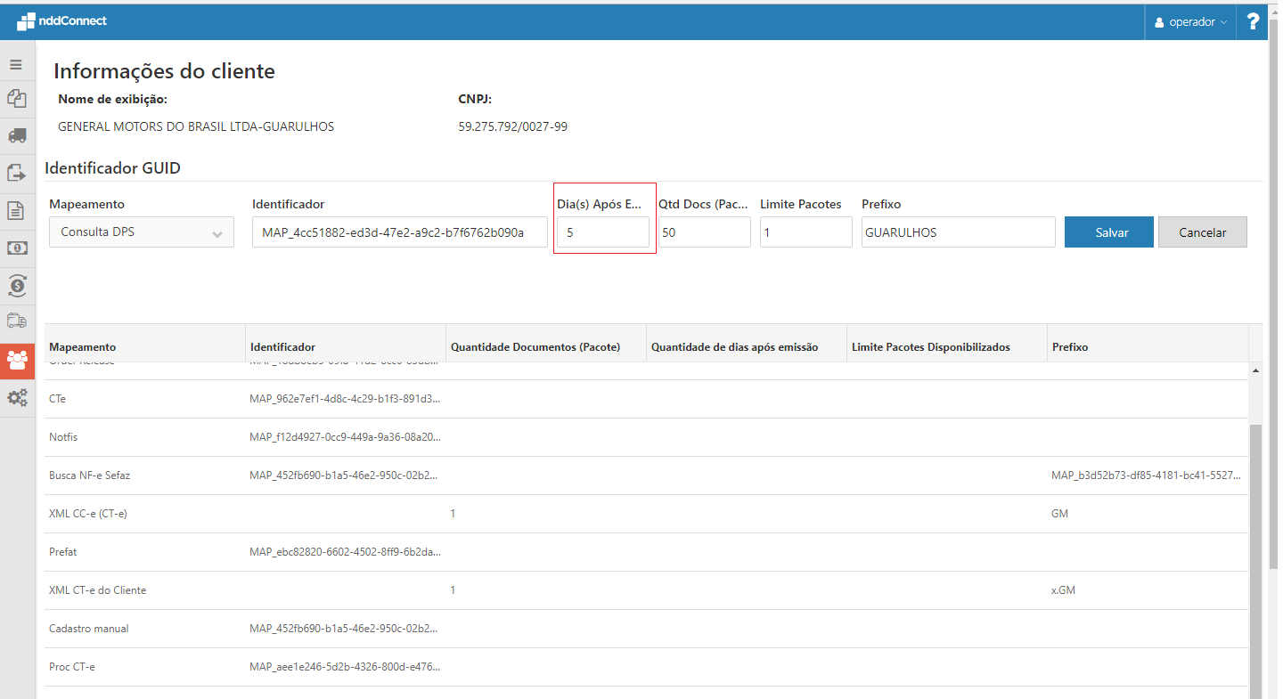 •O identificador é desabilitado para a consulta XML CC-e (CT-e) do cliente e XML CT-e do cliente, pois nestas integrações não é necessário mapeamento, devido que o retorno da mesma é o XML sem tratamento. •A quantidade de documentos (pacote) automaticamente é preenchido com "1" e não possibilita editar, para estes mapeamentos, pois nestas integrações os documentos serão retornados individualmente.