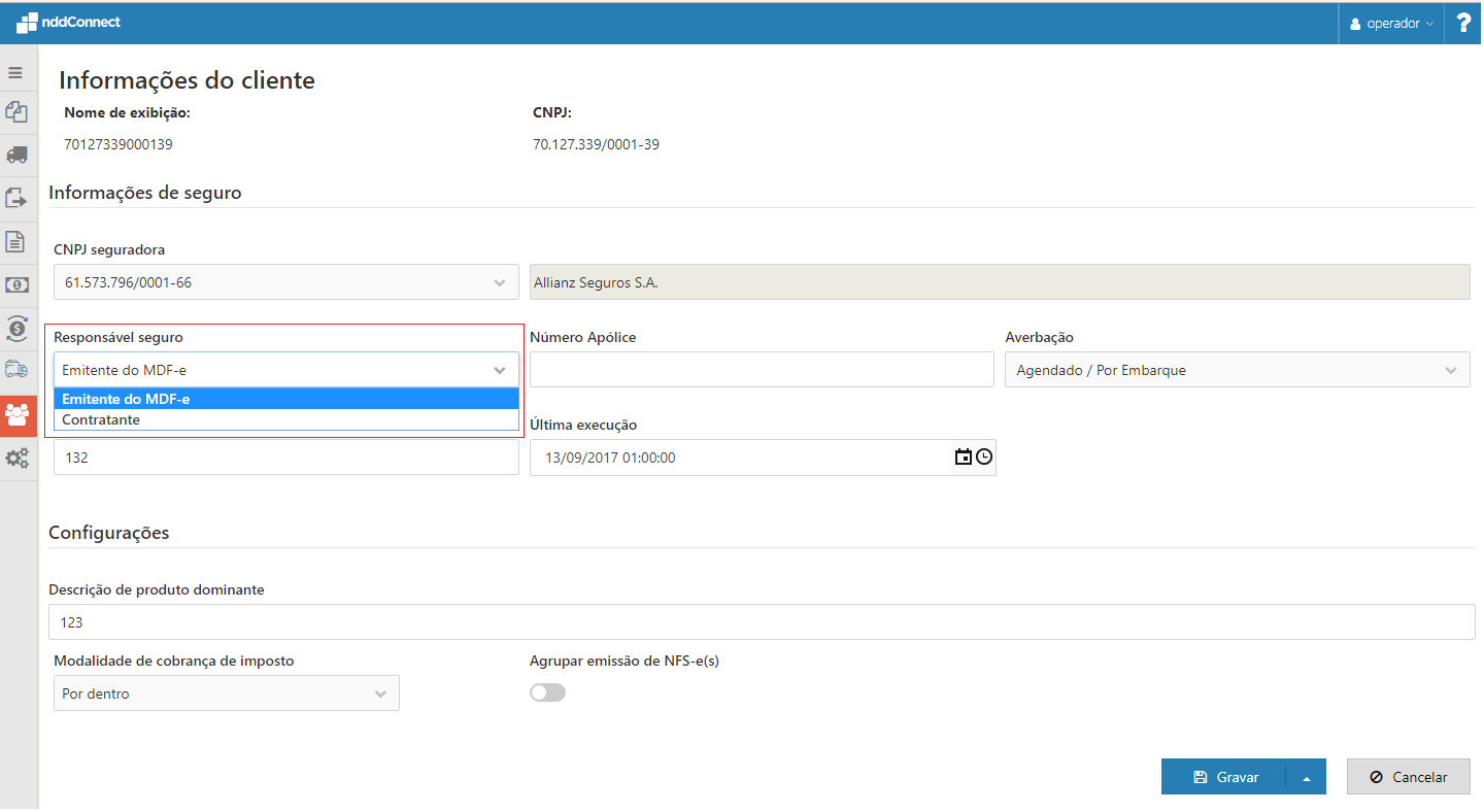 Alterado as opções de responsável pelo seguro, da configuração de emissão (localizado no menu de contexto da grid), as opções para o responsável pelo seguro são as seguintes: 1- Emitente do MDF-e; 2- Contratante (responsável pela contratação do serviço de transporte).
