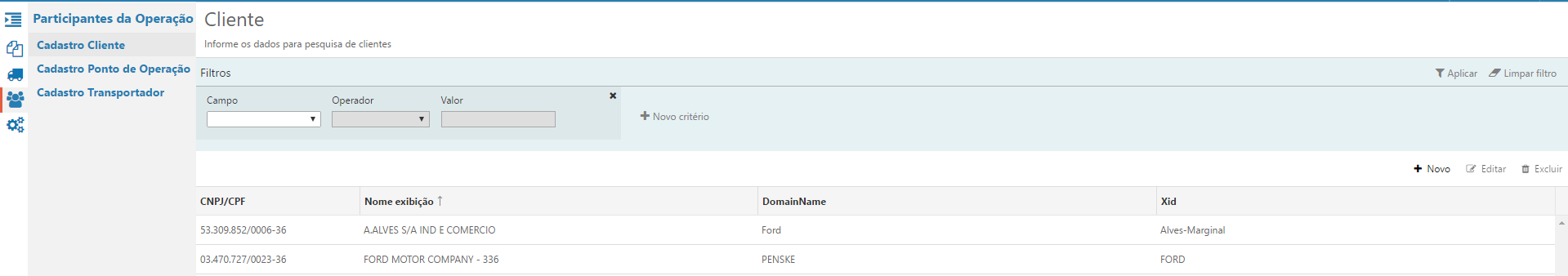Para acessar a tela de cadastro de clientes, o usuário terá que clicar no menu Participantes da Operação - Cadastro Cliente.Nesta tela serão listados os clientes cadastrados, onde o usuário poderá aplicar filtros para localizar um cliente em específico para editar / excluir, ou ainda adicionar um novo cliente.