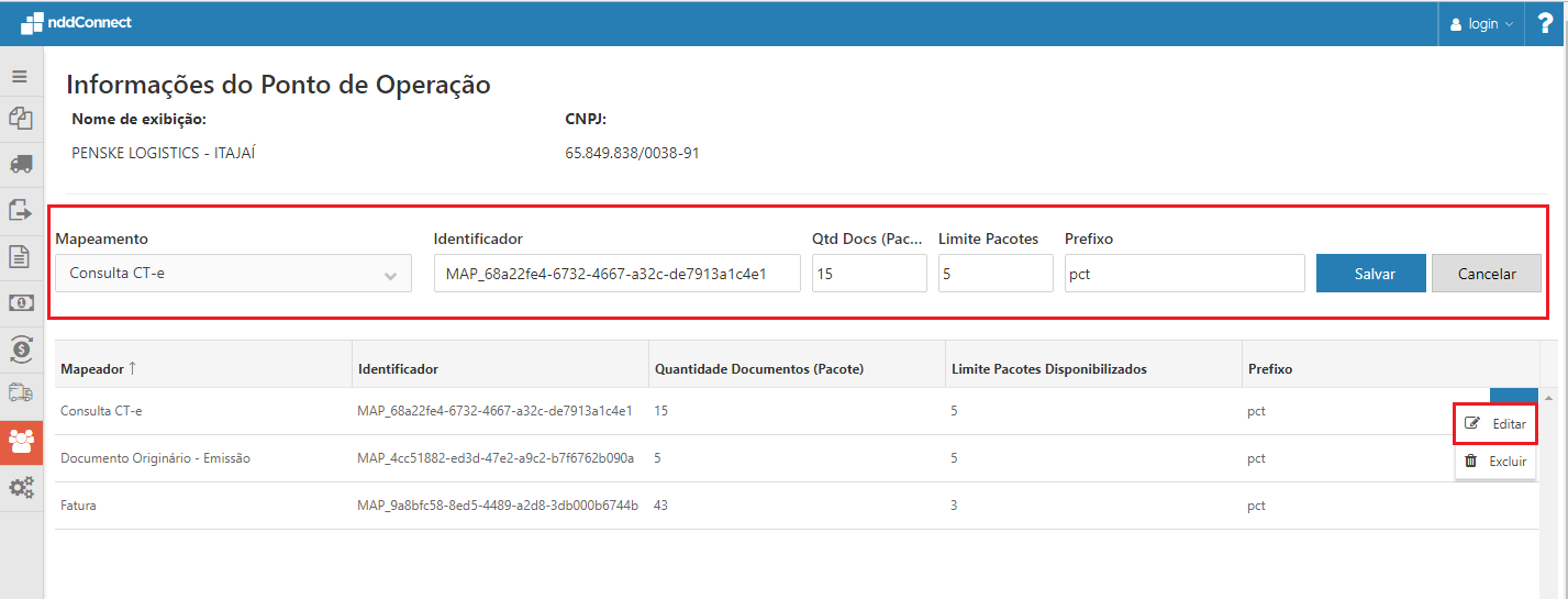 Ao selecionar a opção editar, os dados do mapeamento selecionado serão carregados nos campos acima da grid de visualização para que sejam atualizados.