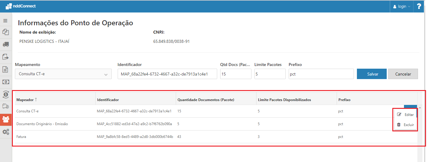 Logo abaixo, está disponível para visualização os mapeamentos cadastrados. Opções de editar e excluir podem ser acessadas através do menu de contexto da mesma grid.