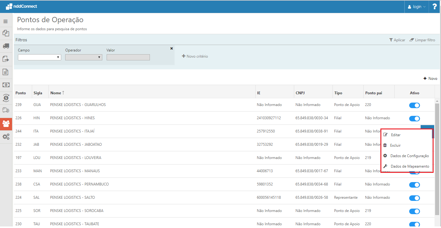 Criado menu de contexto na tela de ponto de operação, o mesmo contém as seguintes opções: •Editar; •Excluir; •Dados de Configuração; •Dados de Mapeamento.