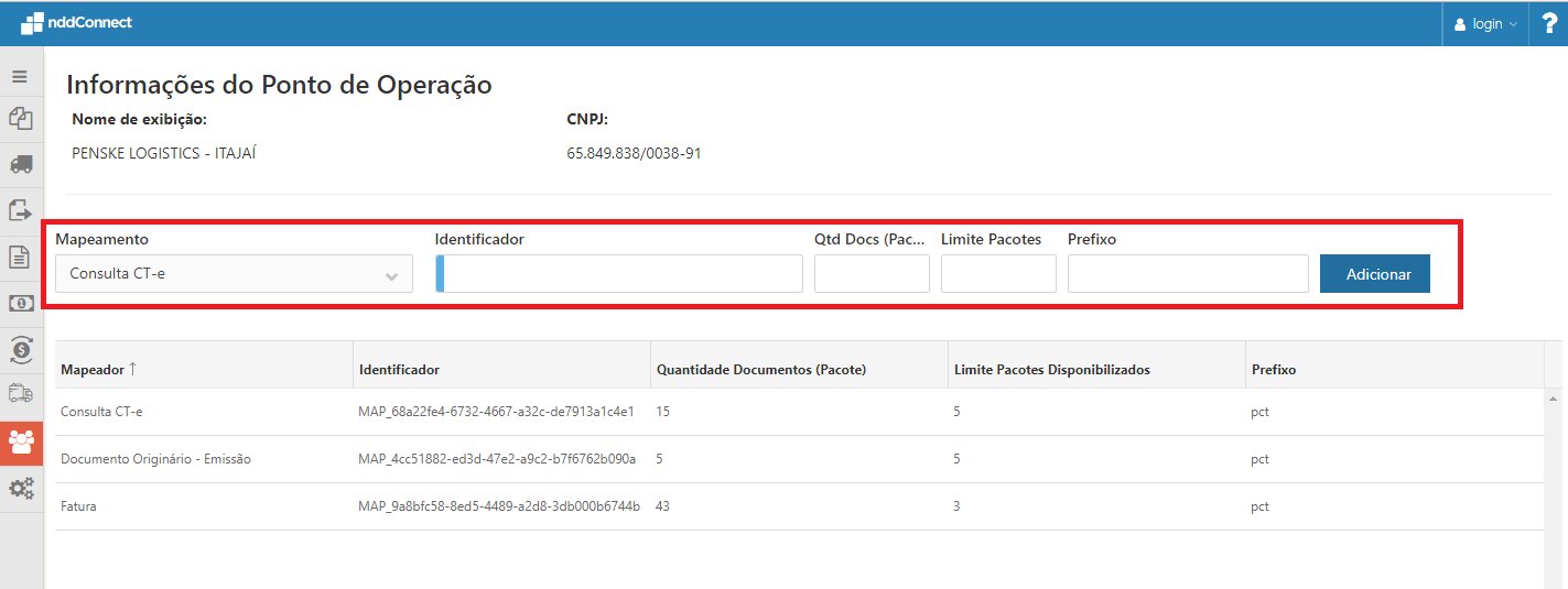 •Mapeamento: Permite selecionar os mapeamentos disponíveis para o ponto de operação: 1.Consulta CT-e; 2.Documento Originário - Emissão; 3.Fatura. •Identificador: Permite informar o GUID do mapeamento, referente ao selecionado anteriormente. É obrigatório informar o identificador. •Qtd Docs (Pacote): Permite informar a quantidade de documentos que irão compor um pacote disponibilizado. •Limite pacotes: Permite informar o limite de pacotes que serão retornados. •Prefixo: Permite informar o prefixo que será usado na nomenclatura do pacote quando disponibilizado.