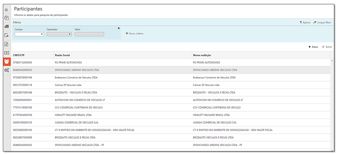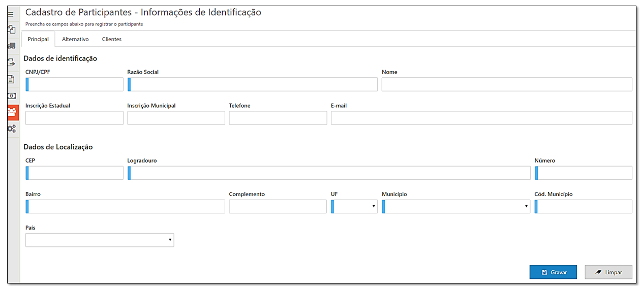 1.Incluída a nova funcionalidade de Cadastro de Participantes, onde ao recepcionar um documento originário será identificado o cliente do mesmo e após, verificado se o participante do processo já está cadastrado na base de dados da localização. Caso não esteja, o cadastro será realizado automaticamente, bem como, o vínculo entre participante e cliente. Assim, em casos de documentos onde o cliente não esteja destacado diretamente no documento fiscal, será possível identificá-lo através do vínculo com os participantes cadastrados. Além do processo automático é possível cadastrar participantes manualmente. Para todo participante cadastrado, obrigatoriamente é necessário efetuar o vínculo do mesmo com no mínimo um cliente.