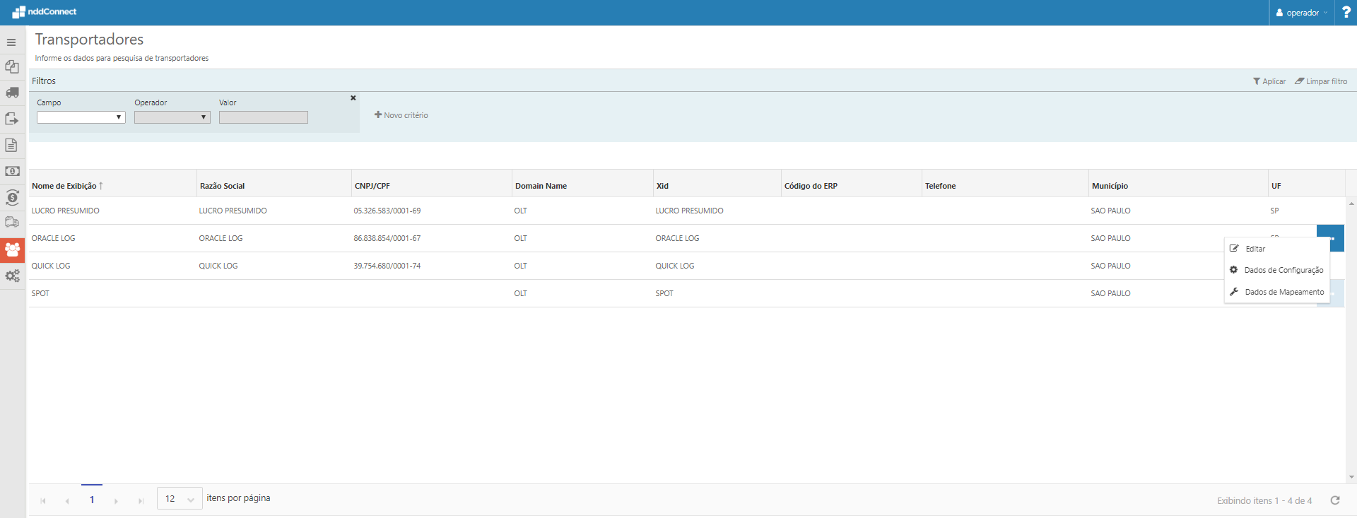 Criado menu de contexto na tela de transportadores, o mesmo contém as seguintes opções: •Editar; •Excluir; •Dados de Configuração; •Dados de Mapeamento.