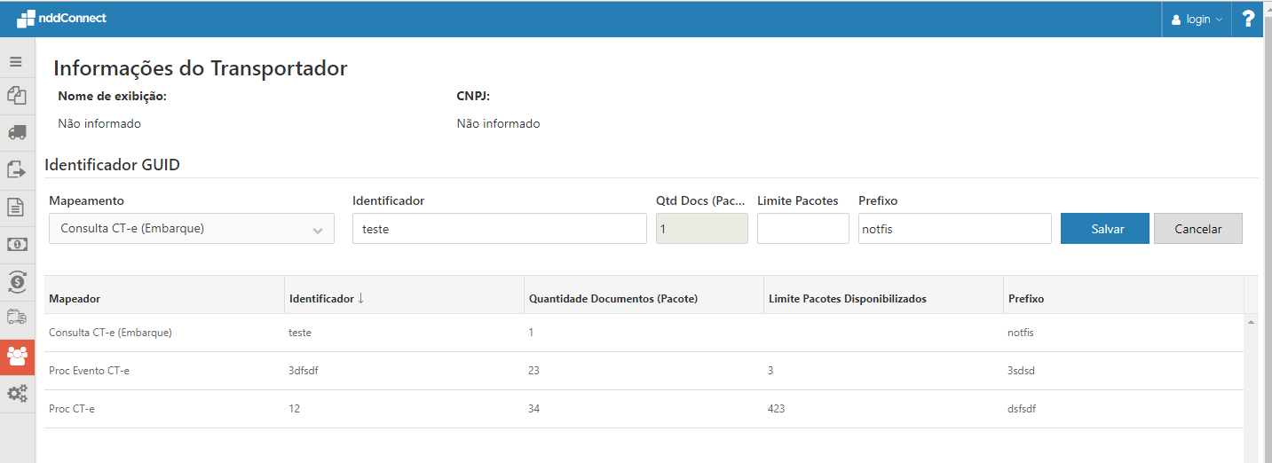 No item "Dados de Mapeamento", Os mapeamentos passam a ser itens da grid e o "limite de pacotes" passa a ser considerado individualmente por mapeamento, assim como os demais campos. O campo "identificador" é informado o GUID do mapeamento selecionado. Adicionado o campo "Qtd Docs(Pacote)" que informa a quantidade de documentos que irão compor um pacote disponibilizado, também incluído o campo "Prefixo" usado na nomenclatura do pacote quando disponibilizado. É possível adicionar somente os mapeamentos referente ao Transportador, podendo excluir ou editar o mesmo.