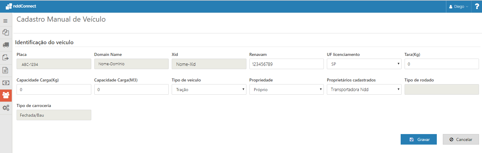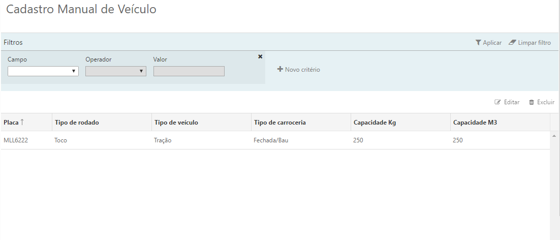 Os veículos são cadastrados automaticamente no momento da recepção do Shipment e através desta tela é possível visualizá-los e, caso necessário, editar ou excluí-los.
