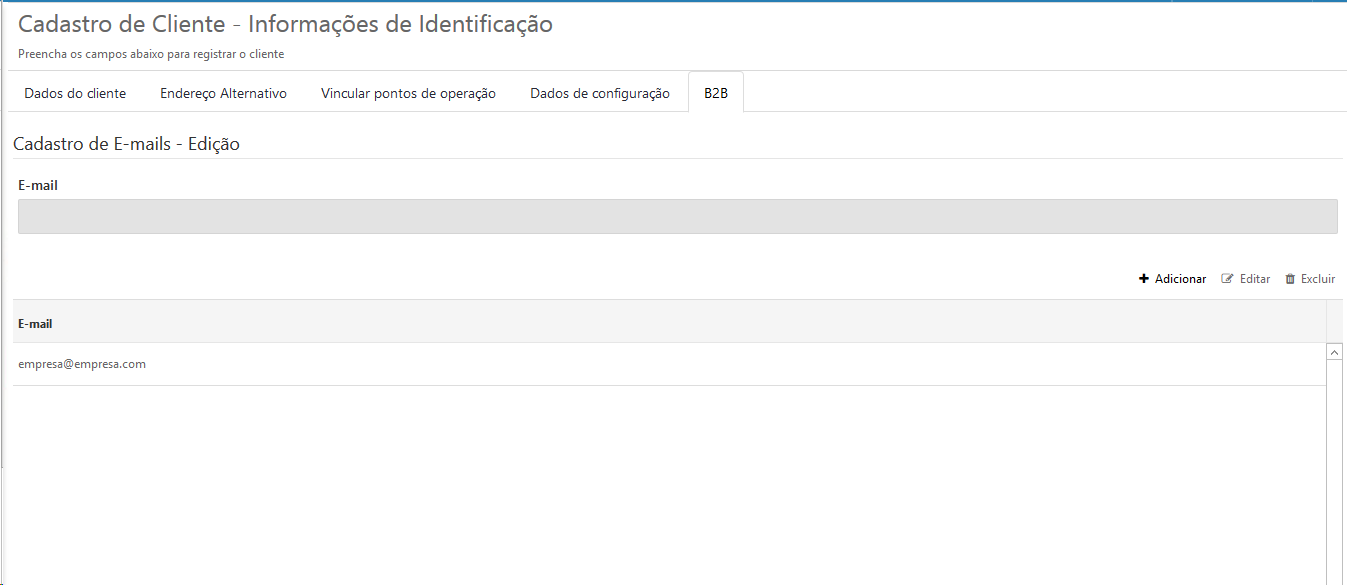 1.Foi adicionada no 'Cadastro Cliente' a aba chamada 'B2B' para que seja possível informar os dados de e-mail, para receber notificações no processo de emissão.