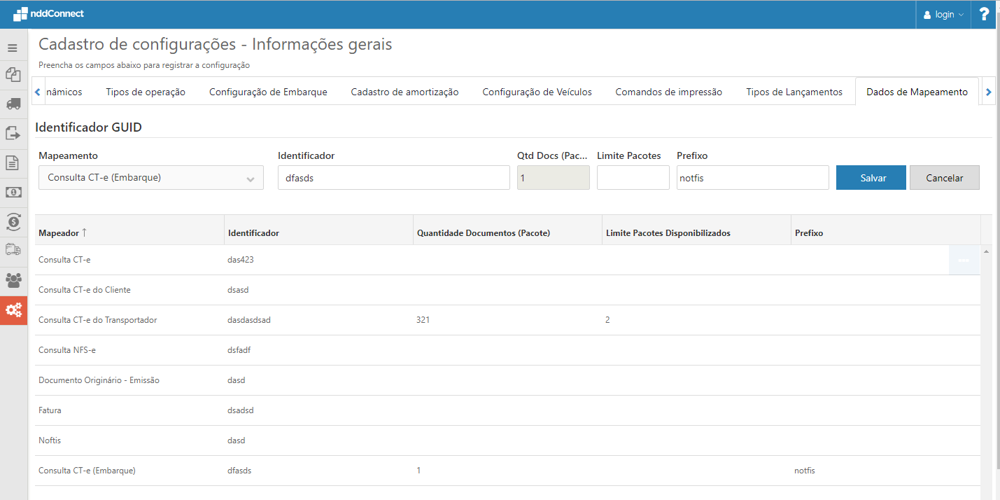 Os mapeamentos passam a ser itens da grid e o "limite de pacotes" passa a ser considerado individualmente por mapeamento, assim como os demais campos, o campo "identificador" é informado o GUID do mapeamento selecionado, foi adicionado o campo "Qtd Docs(Pacote)" que informa a quantidade de documentos que irão compor um pacote disponibilizado, também incluido o campo "Prefixo" o prefixo a ser usado na nomenclatura do pacote quando disponibilizado. É possivel adicionar somente os mapeamentos referente ao Operador, podendo exluir ou editar o mesmo.