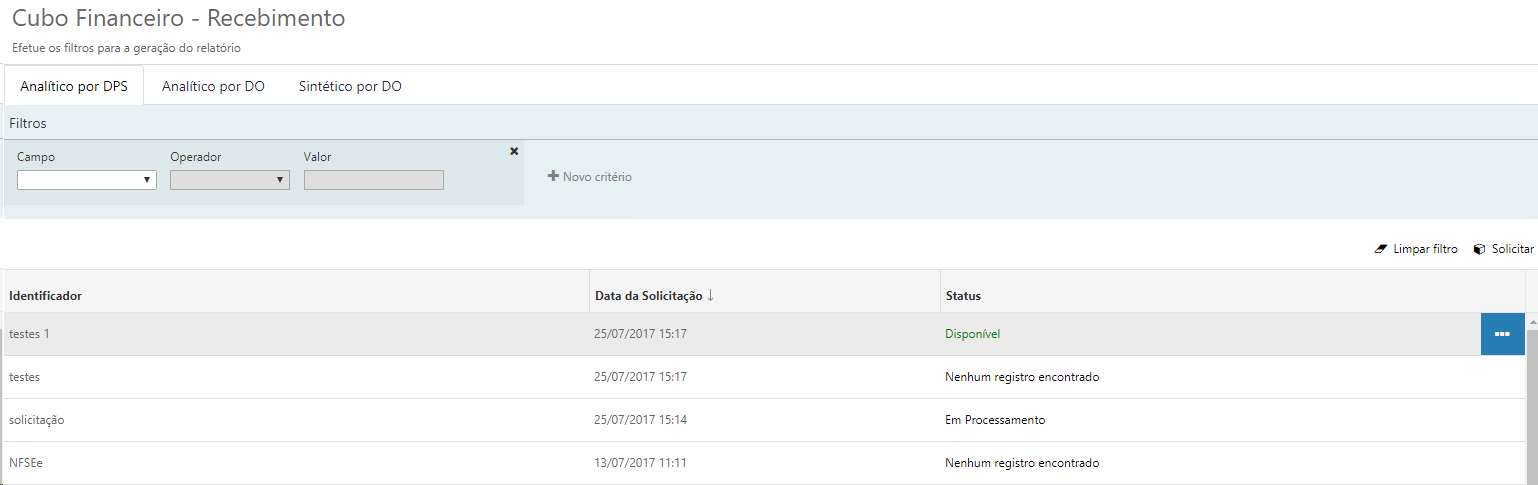 1. Alterado a exibição da coluna 'Status' em todas as abas desta opção de menu para apresentar a descrição; a)As operações de 'Download CSV' e 'Visualizar em tela' foram adicionados ao menu de contexto.