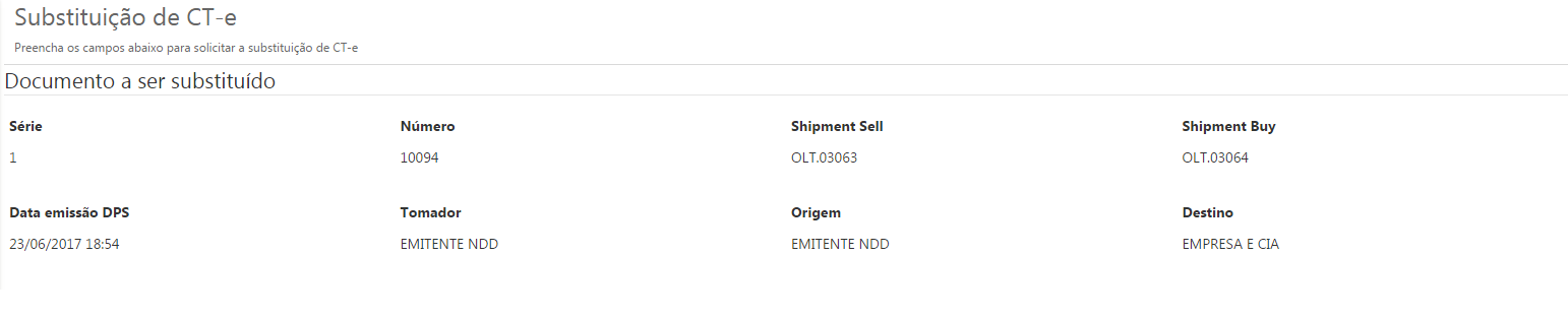 Nesta tela podemos executar o processo de substituição do CTe. 1. Nesta esta etapa podemos ver os dados do documentoa a ser substituido.