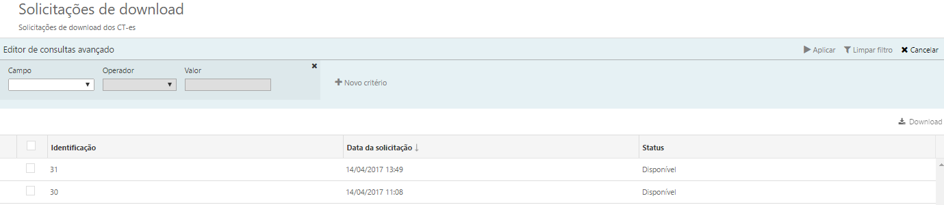1.Solicitações de Download Nesta tela, serão apresentados os documentos disponíveis para download ou apresentando erro. No caso dos documentos disponíveis para download deverá selecionar o (s) documento (s) e clicar download, que estarão disponíveis para download.Caso seja apresentado algum erro no disponibilização de download, os documentos com este status serão apresentados na mesma tela e deverão ser ajustados para possível realização do download.