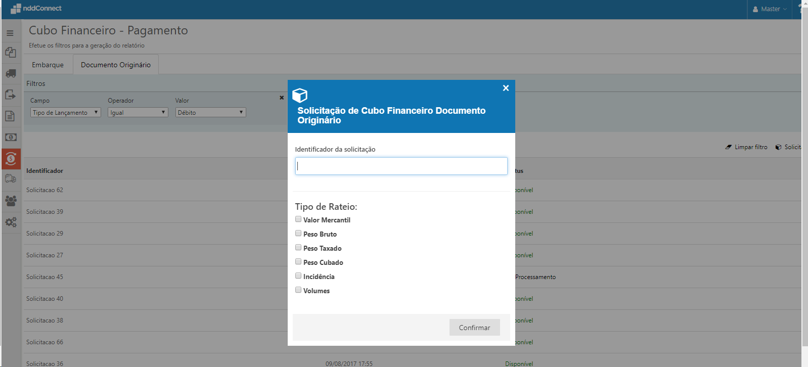 Obs.: Caso seja selecionado um tipo de rateio e o documento originário não possuir informação para ratear, o mesmo não será rateado.
