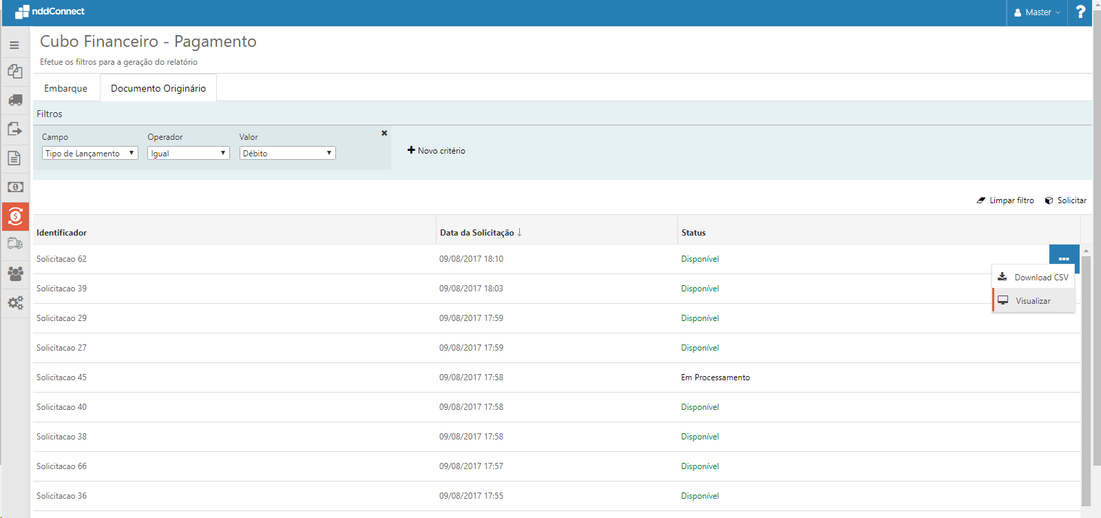 Será possível acompanhar o processo de geração de relatórios pelos seguintes status: •Em processamento; •Disponível: ▪Permite a visualização ou o download do relatório gerado. •Nenhum registro encontrado: ▪Será apresentado este status quando nenhum lançamento for encontrado com base nos filtros aplicados.
