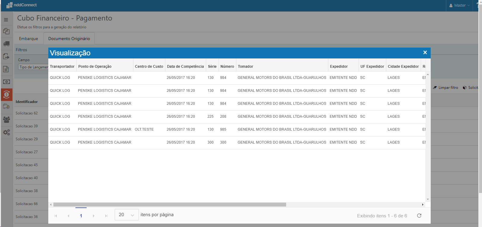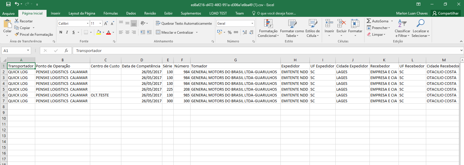 •Transportador; •Ponto de Operação; •Centro de Custo; •Data de Competência; •Série; •Número; •Tomador; •Expedidor; •UF Expedidor; •Cidade Expedidor; •Recebedor; •UF Recebedor; •Cidade Recebedor; •Valor; •Tipo de Lançamento; •Data Lançamento; •Base do Rateio.