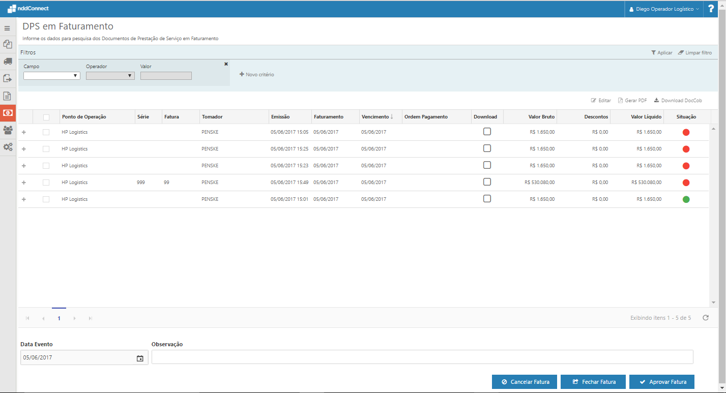Nesta tela são apresentadas todas as faturas montadas, bem como, os DPS que estão agrupados na mesma. Até que a fatura esteja fechada é possível editá-la para incluir ou remover DPS, ou ainda editar o valor de desconto. Quando a mesma estiver correta, o usuário pode fechá-la, tornando este documento uma fatura com número e série. Para que a fatura seja movida para 'DPS em Recebimento', a mesma deve ser aprovada.