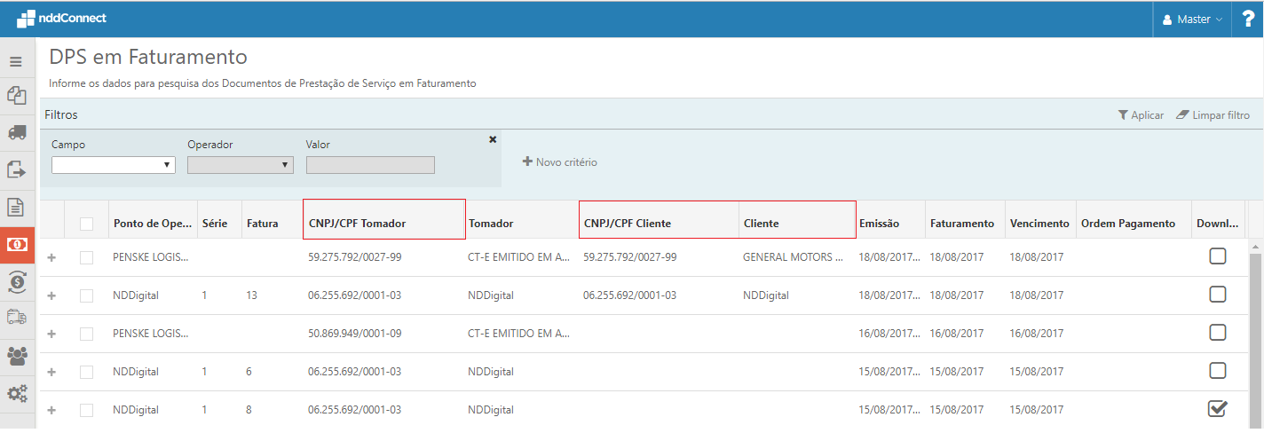 Incluído na visualização do DPS em faturamento as seguintes informações: •CNPJ/CPF Tomador; •CNPJ/CPF Cliente; •Cliente (nome de exibição).