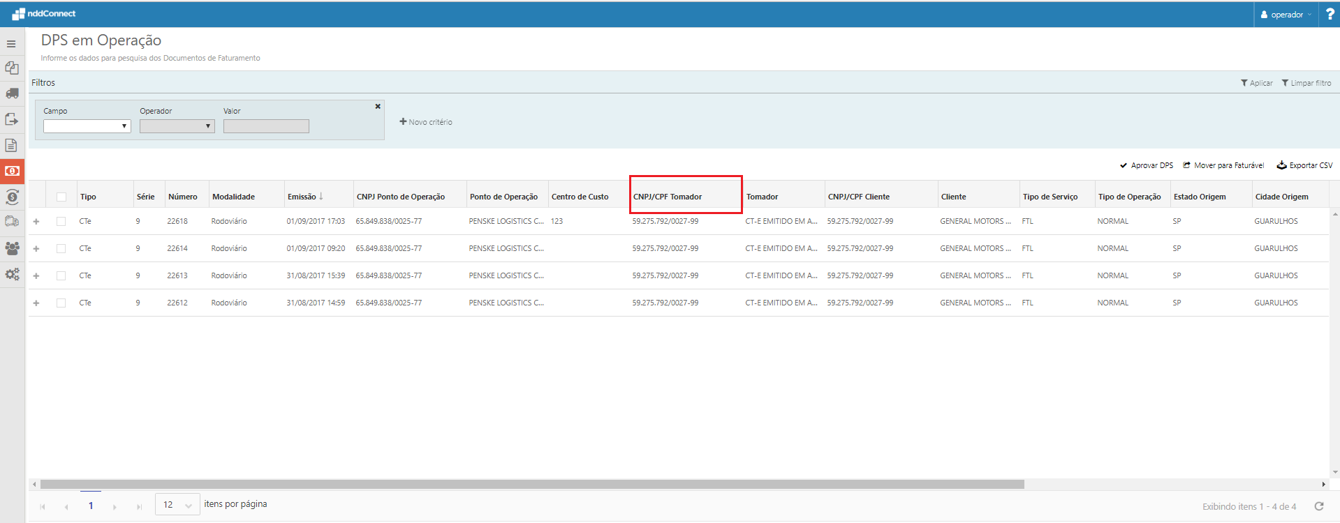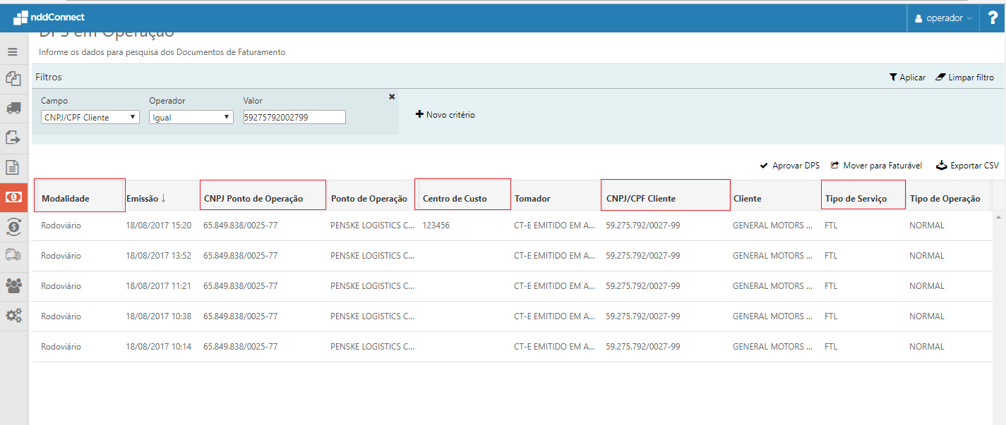 Incluído na visualização dos DPS em operação as seguintes informações: •Modalidade de transporte do CT-e (rodoviário, aéreo, aquaviário, ferroviário, dutoviário, multimodal); •Centro de Custo; •CNPJ Ponto de Operação; •CNPJ/CPF Cliente.