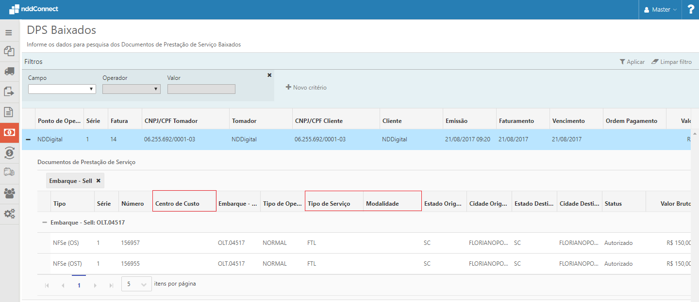 Incluído nos detalhes da fatura, onde exibe o documento de prestação de serviço, as seguintes informações: •Centro de custo; •Tipo de serviço; •Modalidade de transporte do CT-e (rodoviário, aéreo, aquaviário, ferroviário, dutoviário, multimodal).
