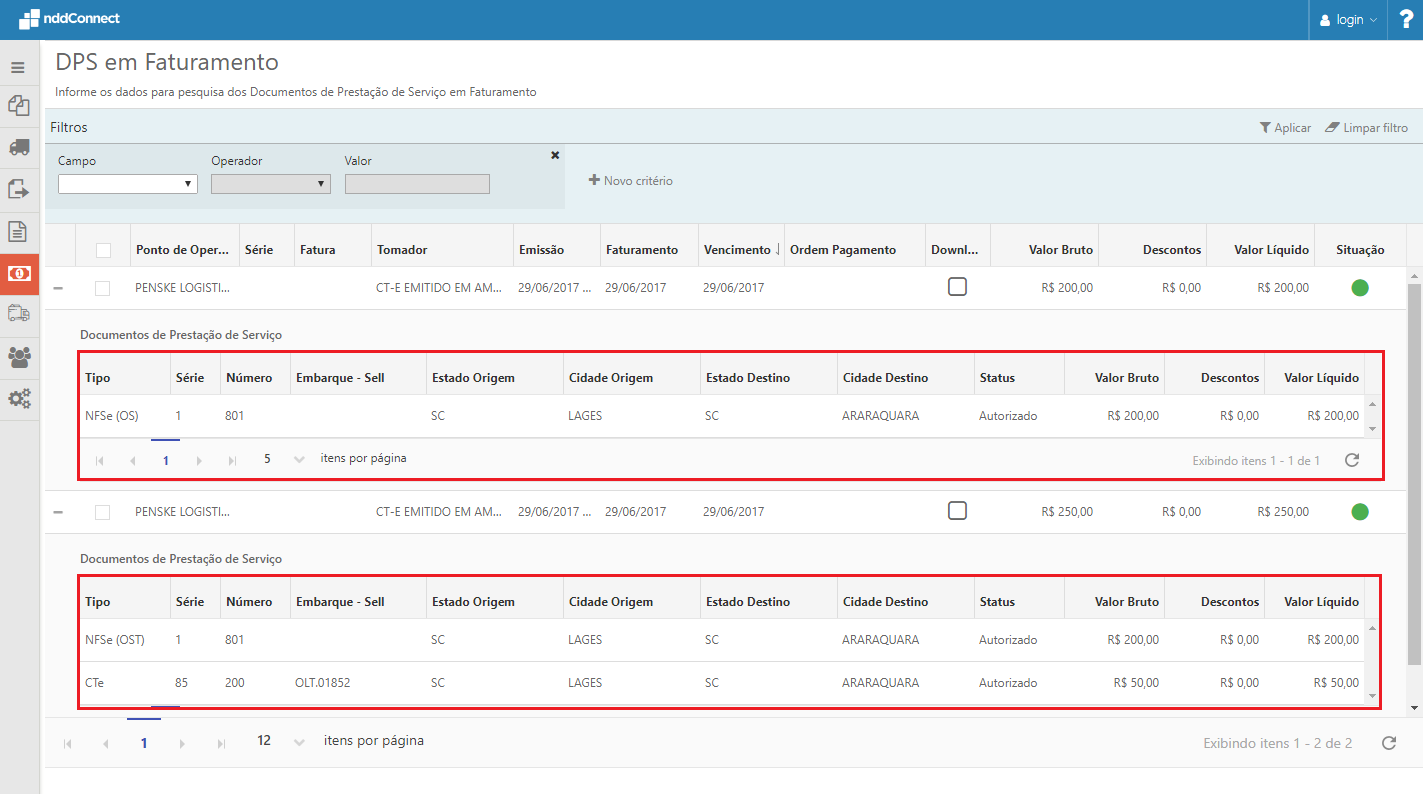 Incluído nos detalhes do DPS em faturamento, os documentos de prestação de serviço do tipo NFS-e OS e NFS-e OST para que possa verificar os documentos vinculados a fatura.