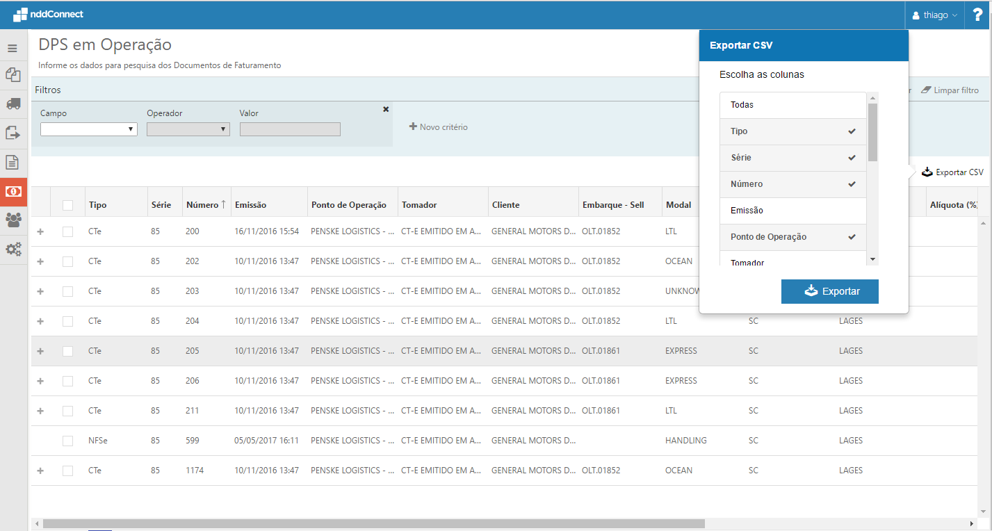 As informações estão disponíveis para serem exportadas no formato CSV. Podendo ser todas as informações do cabeçalho ou definir quais informações serão exportadas, levando em consideração a ordenação das colunas nesse momento.