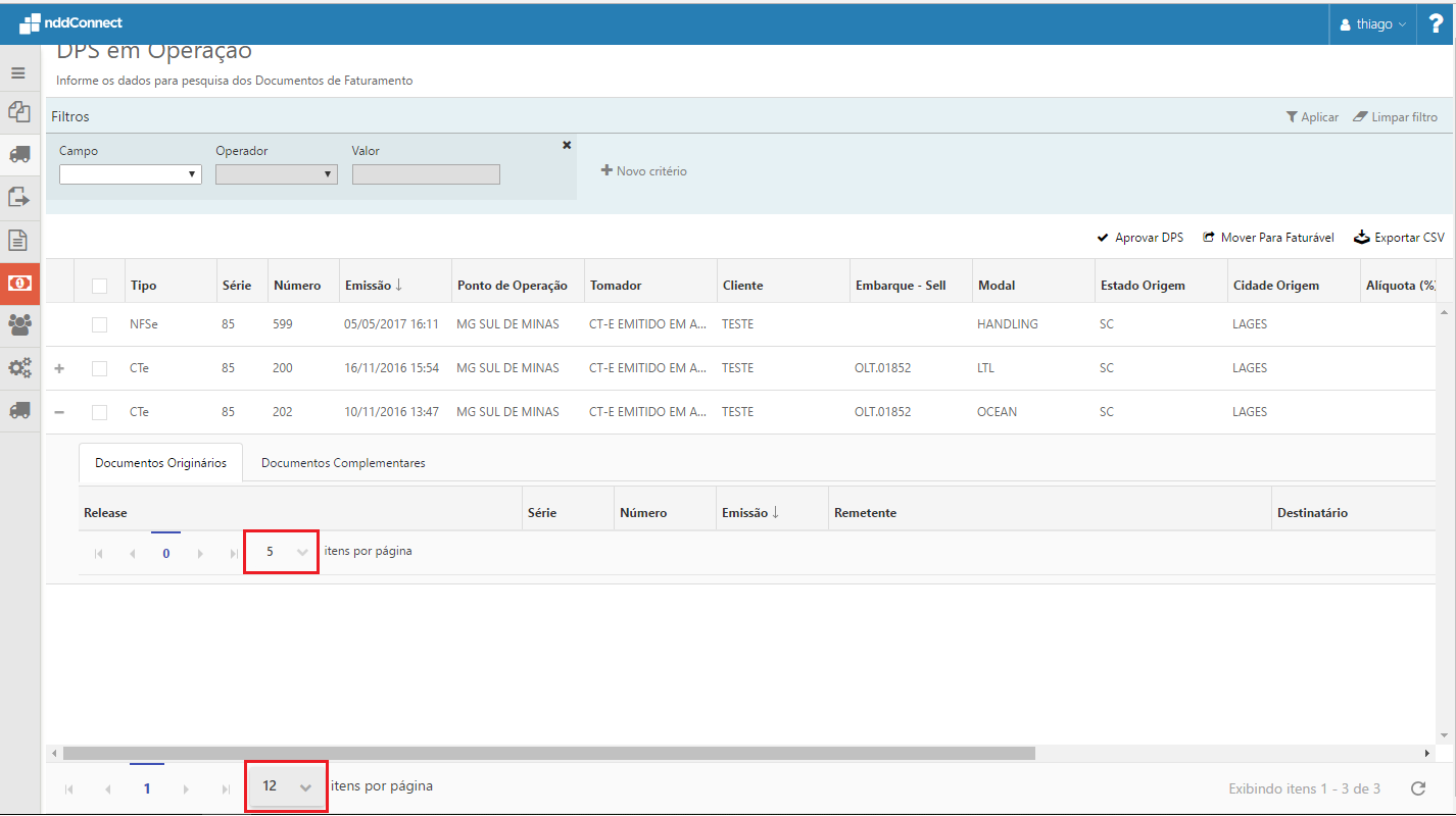 É possível selecionar a quantidade de itens que será exibido por página, o mesmo também está disponivel para as demais telas.