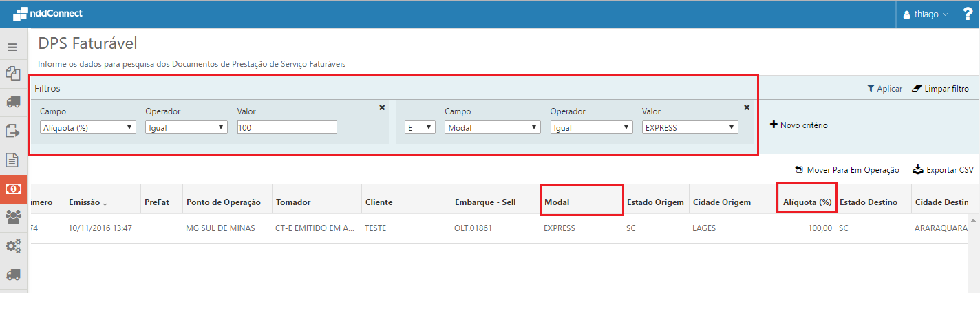 Na tela de visualização de DPS Faturável foi adicionado a coluna Alíquota (%) e a coluna Modal, as mesmas também foram adicionadas ao filtro.