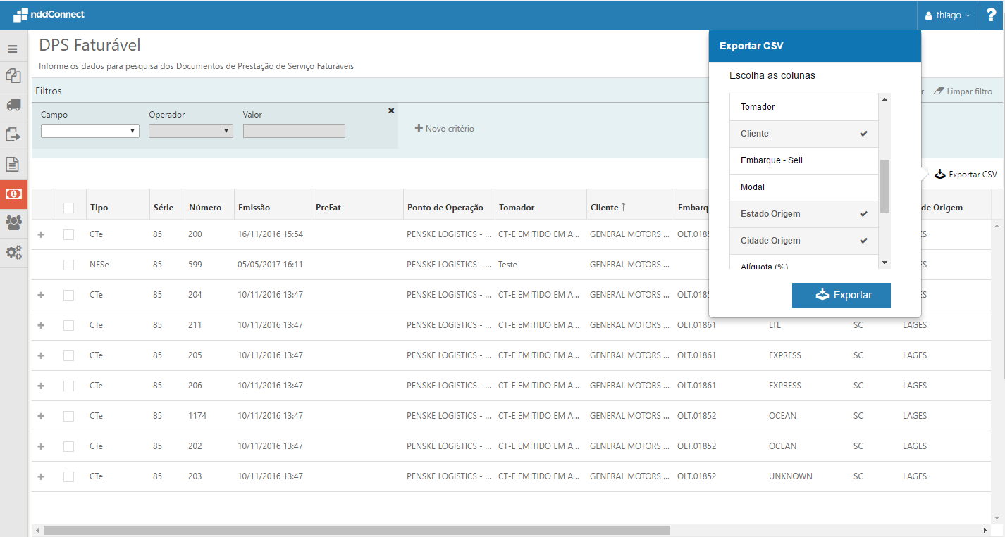 As informações estão disponíveis para serem exportadas no formato CSV. Podendo ser todas as informações do cabeçalho ou definir quais informações serão exportadas, levando em consideração a ordenação das colunas nesse momento.