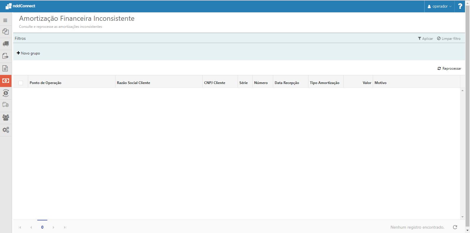 Disponibilizada a tela de amortizações inconsistentes, para visualizar amortizações nas seguintes condições: •Cliente não encontrado; •Fatura não encontrada; •Fatura cancelada ou diferente de em recebimento; •Tipo de amortização não cadastrada; •Valor informado para amortização é inválido; •Data da postergação é inferior ou igual a data de vencimento atual; •Cancelamento não realizado; •O valor informado para desconto total deve ser igual ao valor líquido da fatura.