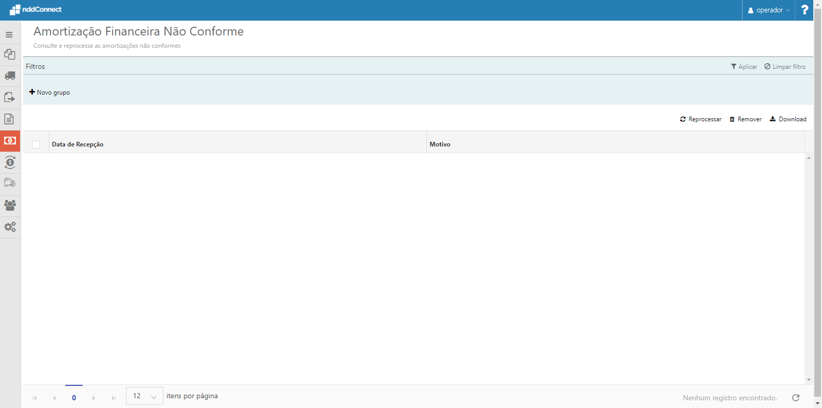 Navegação: Entrega 12 - Query Report - Aging - Markup > Portal do Operador Logístico > Gestão de Faturamento > Amortização Financeira