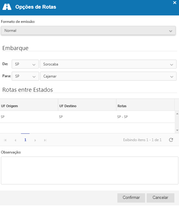 •Emitir MFDe: Ao acionar a Opção, será aberta a janela de "Opções de Rotas", nela estão presentes as seguintes informações: ▪Formato de emissão: campo que identifica o modo de emissão do embarque selecionado (normal, contingência eletrônica, contingência impressa). ▪Locais de inicio e fim do embarque: é sugerido a origem e destino da entrega, mas pode sofrer alteração. ▪Rotas cadastradas no sistema que informam o percurso a ser adotado na viagem. Rotas que possuam mais de um caminho devem informadas. ▪Observações:Informações adicionais do MDFe.