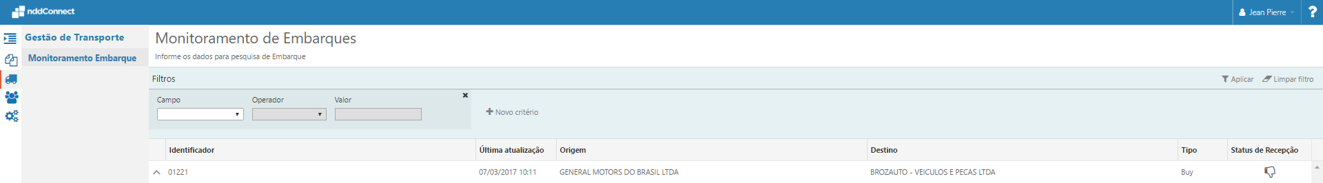 Para acessar a tela de monitoramento de embarque, o usuário terá que clicar no menu Gestão de Transporte - Monitoramento Embarque.Nesta tela o usuário poderá utilizar filtros para buscar um embarque em específico. Sendo que, a validação do shipment não estando de acordo o status da recepção estará como falha. E para melhor visualização da inconsistência, o usuário deverá clicar sobre o simbolo (^) ao lado do identificador.