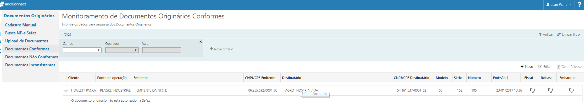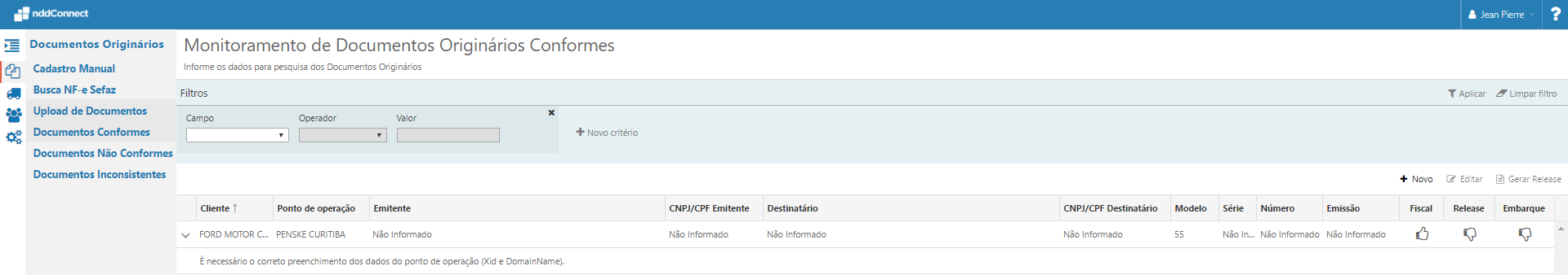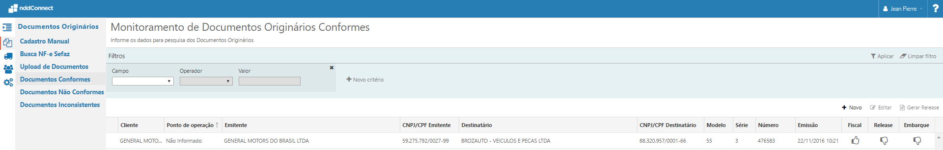Para acessar a tela de documentos conformes, o usuário terá que clicar no menu Documentos Originários - Documentos Conformes. Nesta tela o usuário poderá editar, gerar release e criar um novo cadastro de documentos originários (item 5 a 5.4). Além destas funcionalidades o usuário terá a visualização dos documentos que encontram-se com as seguintes características: