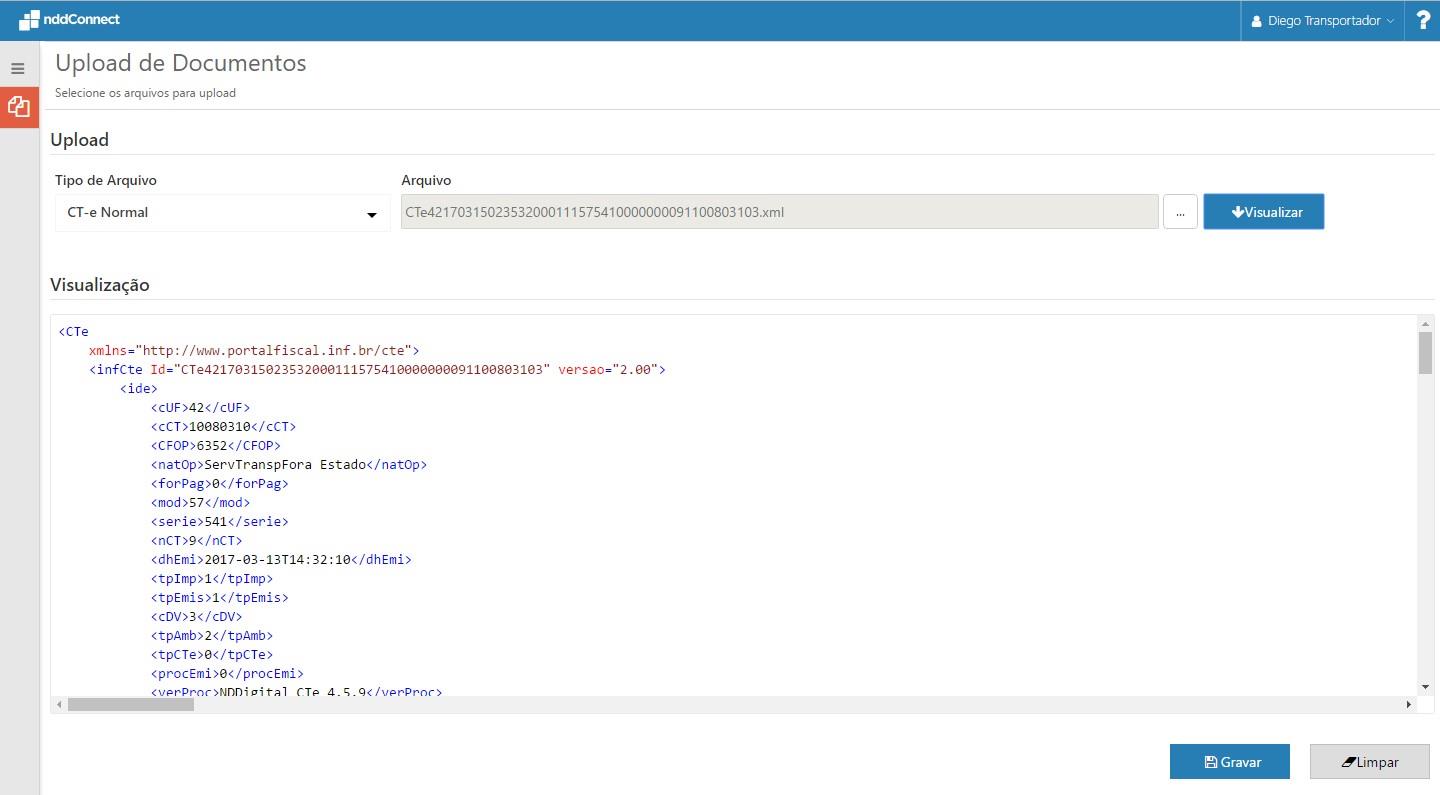 Para os arquivos no formato .xml é disponibilizada a função de visualização, não sendo obrigatório para efetuar o upload.