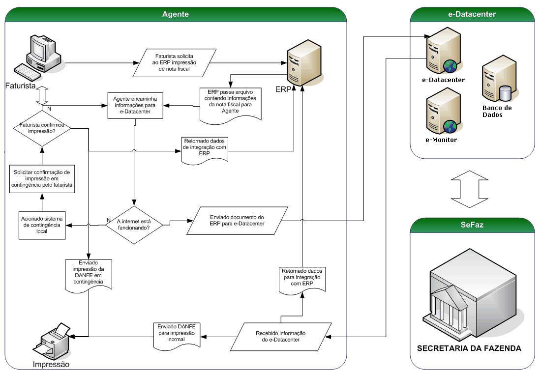 O processo inicia com a solicitação do usuário, passando pela saída do ERP, retorno ao próprio ERP e a impressão do documento.